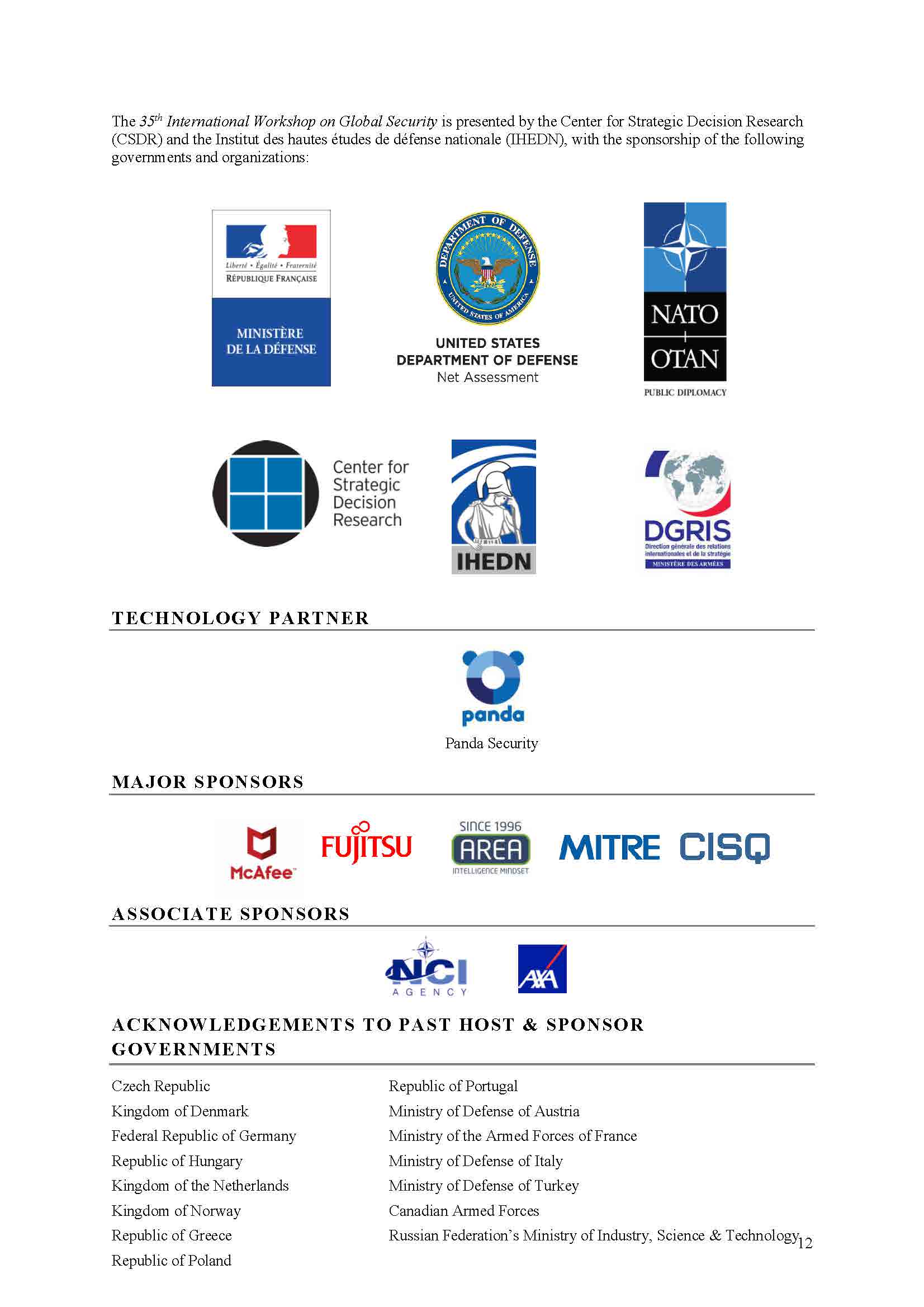 Major speakers of the Paris Workshop included Georgian Vice Prime Minister Giorgi Baramidze, former Ukrainian Foreign Minister Borys Tarasyuk, Estonian Defense Minister Jaak Aaviksoo, Albanian Defense Minister Fatmir Mediu, Bulgarian Defense Minister Veselin Bliznakov, Georgian Foreign Minister Gela Bezhuashvili, Italian Chief of Defense Admiral Giampaolo Di Paola, Polish Chief of Defense General Franciszek Gagor, Supreme Headquarters Allied Powers Europe (SHAPE) Chief of Staff General Rainer Schuwirth, Allied Joint Force Commander Gen. Egon Ramms, former Supreme Allied Commander Europe (SACEUR) General George Joulwan, former SACEUR General James Jones, OSCE Dir Gen Marc Perrin de Brichambaut, OPCW Dir. Gen. Rogelio Pfirter, British Amb to NATO Stewart Eldon, Spain's NATO Amb Pablo Benavides Orgaz, Italian Amb to NATO Stefano Stefanini, Russian Amb to the EU Vladimir Chizhov, Algeria’s U.N. Amb. Youcef Yousfi, Hunary's UN Ambassador Gabor Brodi, Pakistan’s U.N. Ambassador Munir Akram, French Defense Ministry Dir. of Strategic Affairs Jean de Ponton d’Amécourt, U.K. Special Representative for Climate Change John Ashton, Thales Senior VP Dr. Edgar Buckley, Alenia Aeronautica CEO Ing. Giovanni Bertolone, Lockheed Martin Senior VP Robert Trice, Northrop Grumman IT Global President Kent Schneider, Microsoft Exec Dir Tim Bloechl, EADS Chief Operating Officer Mr. Marwan Lahoud, U.S. Assistant to the Sec of Def Dr. Arthur T. Hopkins, U.S. Director for International Cooperation Mr. Alfred Volkman, U.S. Dep Asst Sec Robert Lentz, and U.S. Assistant Secretary of Defense Hon. John Grimes.