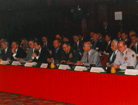 A Session at the XIIIth NATO Workshop: United States Deputy Secretary of Defense John White, Estonian Prime Minister Tiit Vähi, NATO Secretary General Javier Solana, Polish President Aleksander Kwasniewski, SACEUR General George Joulwan, NATO Workshop Chairman Dr. Roger Weissinger-Baylon, Bulgarian President Zhelyu Zhelev,Chairman of the NATO Military Committee General Klaus Naumann (from left to right).